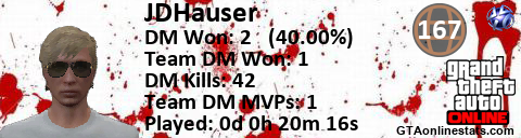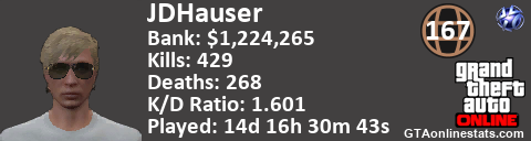 [URL=http://GTAonlinestats.com/showplayer/JDHauser][IMG]http://GTAonlinestats.com/dmsignature/JDHauser/sig.png[/IMG][/URL]