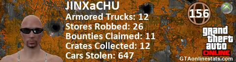 [URL=http://GTAonlinestats.com/showplayer/JINXaCHU][IMG]http://GTAonlinestats.com/crimesignature/JINXaCHU/sig.png[/IMG][/URL]