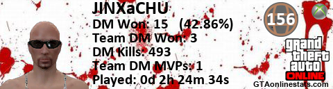 [URL=http://GTAonlinestats.com/showplayer/JINXaCHU][IMG]http://GTAonlinestats.com/greysignature/JINXaCHU/sig.png[/IMG][/URL]