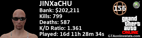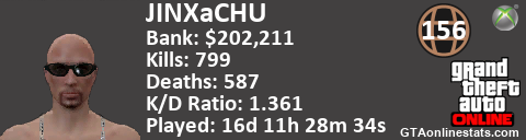 <a href="http://GTAonlinestats.com/showplayer/JINXaCHU"><img src="http://GTAonlinestats.com/signature/JINXaCHU/sig.png" alt="JINXaCHU" border="0" /></a>