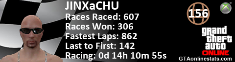 <a href="http://GTAonlinestats.com/showplayer/JINXaCHU"><img src="http://GTAonlinestats.com/racesignature/JINXaCHU/sig.png" alt="JINXaCHU" border="0" /></a>