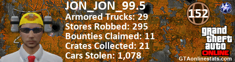 [URL=http://GTAonlinestats.com/showplayer/JON_JON_99.5][IMG]http://GTAonlinestats.com/randomsignature/JON_JON_99.5/sig.png[/IMG][/URL]