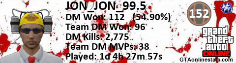 [URL=http://GTAonlinestats.com/showplayer/JON_JON_99.5][IMG]http://GTAonlinestats.com/dmsignature/JON_JON_99.5/sig.png[/IMG][/URL]