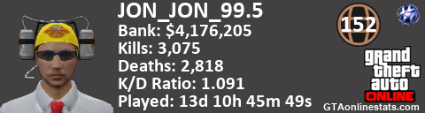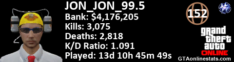 [URL=http://GTAonlinestats.com/showplayer/JON_JON_99.5][IMG]http://GTAonlinestats.com/signature/JON_JON_99.5/sig.png[/IMG][/URL]