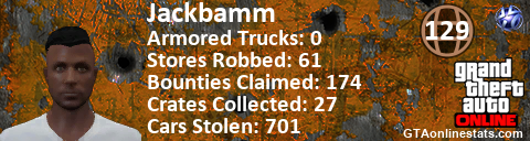 <a href="http://GTAonlinestats.com/showplayer/Jackbamm"><img src="http://GTAonlinestats.com/randomsignature/Jackbamm/sig.png" alt="Jackbamm" border="0" /></a>
