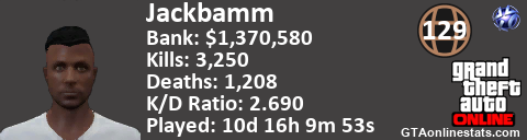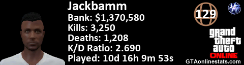 <a href="http://GTAonlinestats.com/showplayer/Jackbamm"><img src="http://GTAonlinestats.com/dmsignature/Jackbamm/sig.png" alt="Jackbamm" border="0" /></a>