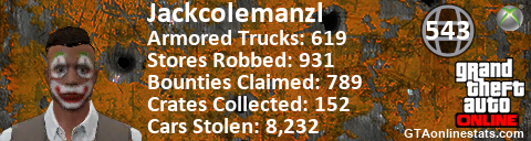 [URL=http://GTAonlinestats.com/showplayer/Jackcolemanzl][IMG]http://GTAonlinestats.com/randomsignature/Jackcolemanzl/sig.png[/IMG][/URL]