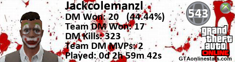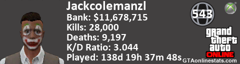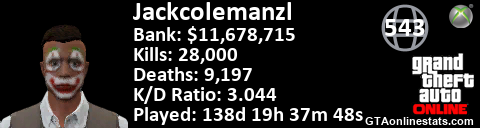 [URL=http://GTAonlinestats.com/showplayer/Jackcolemanzl][IMG]http://GTAonlinestats.com/dmsignature/Jackcolemanzl/sig.png[/IMG][/URL]