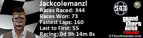 <a href="http://GTAonlinestats.com/showplayer/Jackcolemanzl"><img src="http://GTAonlinestats.com/racesignature/Jackcolemanzl/sig.png" alt="Jackcolemanzl" border="0" /></a>