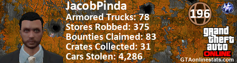 [URL=http://GTAonlinestats.com/showplayer/JacobPinda][IMG]http://GTAonlinestats.com/signature/JacobPinda/sig.png[/IMG][/URL]