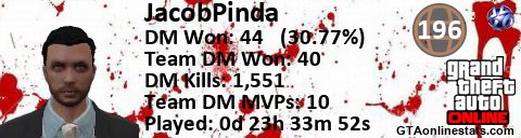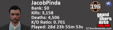 [URL=http://GTAonlinestats.com/showplayer/JacobPinda][IMG]http://GTAonlinestats.com/dmsignature/JacobPinda/sig.png[/IMG][/URL]