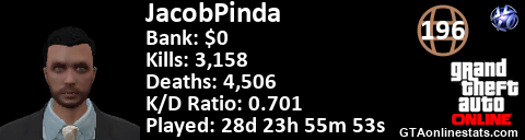 <a href="http://GTAonlinestats.com/showplayer/JacobPinda"><img src="http://GTAonlinestats.com/dmsignature/JacobPinda/sig.png" alt="JacobPinda" border="0" /></a>
