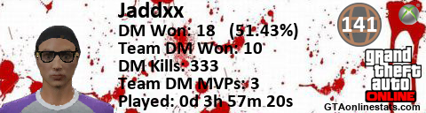 [URL=http://GTAonlinestats.com/showplayer/Jaddxx][IMG]http://GTAonlinestats.com/dmsignature/Jaddxx/sig.png[/IMG][/URL]