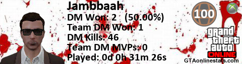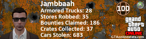 [URL=http://GTAonlinestats.com/showplayer/Jambbaah][IMG]http://GTAonlinestats.com/randomsignature/Jambbaah/sig.png[/IMG][/URL]