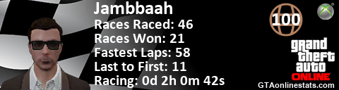 <a href="http://GTAonlinestats.com/showplayer/Jambbaah"><img src="http://GTAonlinestats.com/racesignature/Jambbaah/sig.png" alt="Jambbaah" border="0" /></a>