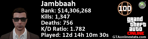 [URL=http://GTAonlinestats.com/showplayer/Jambbaah][IMG]http://GTAonlinestats.com/signature/Jambbaah/sig.png[/IMG][/URL]