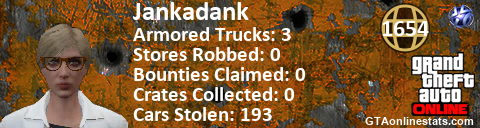 [URL=http://GTAonlinestats.com/showplayer/Jankadank/2][IMG]http://GTAonlinestats.com/crimesignature/Jankadank/2/sig.png[/IMG][/URL]