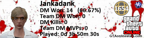 [URL=http://GTAonlinestats.com/showplayer/Jankadank/2][IMG]http://GTAonlinestats.com/signature/Jankadank/2/sig.png[/IMG][/URL]