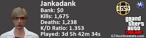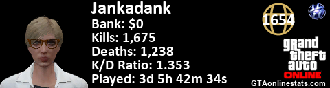 <a href="http://GTAonlinestats.com/showplayer/Jankadank/2"><img src="http://GTAonlinestats.com/signature/Jankadank/2/sig.png" alt="Jankadank" border="0" /></a>