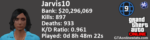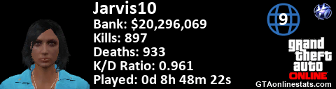 <a href="http://GTAonlinestats.com/showplayer/Jarvis10/2"><img src="http://GTAonlinestats.com/randomsignature/Jarvis10/2/sig.png" alt="Jarvis10" border="0" /></a>