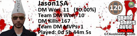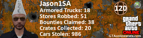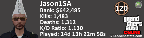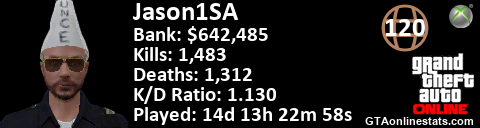 [URL=http://GTAonlinestats.com/showplayer/Jason1SA][IMG]http://GTAonlinestats.com/signature/Jason1SA/sig.png[/IMG][/URL]