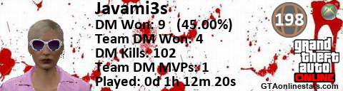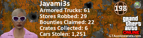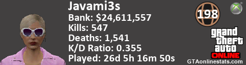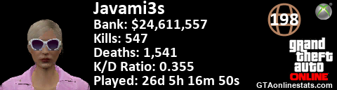 [URL=http://GTAonlinestats.com/showplayer/Javami3s][IMG]http://GTAonlinestats.com/dmsignature/Javami3s/sig.png[/IMG][/URL]