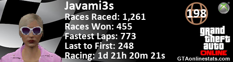 <a href="http://GTAonlinestats.com/showplayer/Javami3s"><img src="http://GTAonlinestats.com/racesignature/Javami3s/sig.png" alt="Javami3s" border="0" /></a>