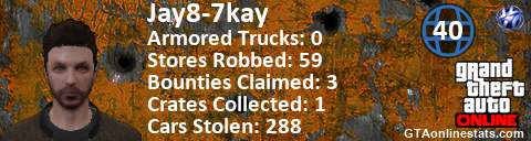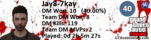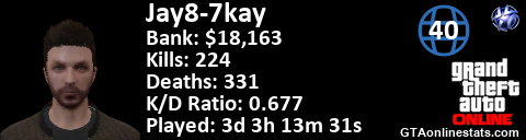 [URL=http://GTAonlinestats.com/showplayer/Jay8-7kay][IMG]http://GTAonlinestats.com/signature/Jay8-7kay/sig.png[/IMG][/URL]