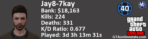 [URL=http://GTAonlinestats.com/showplayer/Jay8-7kay][IMG]http://GTAonlinestats.com/greysignature/Jay8-7kay/sig.png[/IMG][/URL]