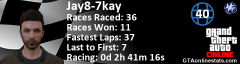 <a href="http://GTAonlinestats.com/showplayer/Jay8-7kay"><img src="http://GTAonlinestats.com/racesignature/Jay8-7kay/sig.png" alt="Jay8-7kay" border="0" /></a>