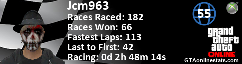 <a href="http://GTAonlinestats.com/showplayer/Jcm963/2"><img src="http://GTAonlinestats.com/racesignature/Jcm963/2/sig.png" alt="Jcm963" border="0" /></a>
