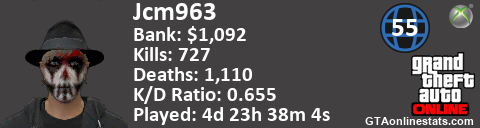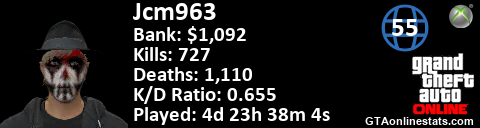 <a href="http://GTAonlinestats.com/showplayer/Jcm963/2"><img src="http://GTAonlinestats.com/dmsignature/Jcm963/2/sig.png" alt="Jcm963" border="0" /></a>