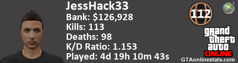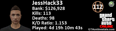 <a href="http://GTAonlinestats.com/showplayer/JessHack33"><img src="http://GTAonlinestats.com/randomsignature/JessHack33/sig.png" alt="JessHack33" border="0" /></a>