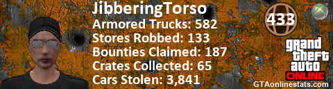 [URL=http://GTAonlinestats.com/showplayer/JibberingTorso][IMG]http://GTAonlinestats.com/randomsignature/JibberingTorso/sig.png[/IMG][/URL]