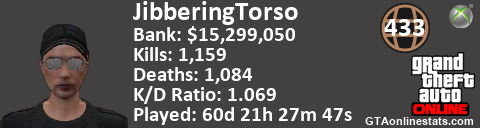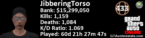 <a href="http://GTAonlinestats.com/showplayer/JibberingTorso"><img src="http://GTAonlinestats.com/signature/JibberingTorso/sig.png" alt="JibberingTorso" border="0" /></a>