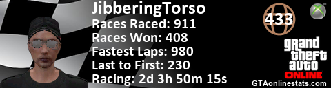 [URL=http://GTAonlinestats.com/showplayer/JibberingTorso][IMG]http://GTAonlinestats.com/racesignature/JibberingTorso/sig.png[/IMG][/URL]