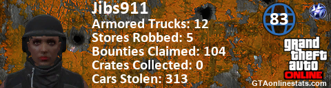 [URL=http://GTAonlinestats.com/showplayer/Jibs911/2][IMG]http://GTAonlinestats.com/crimesignature/Jibs911/2/sig.png[/IMG][/URL]