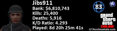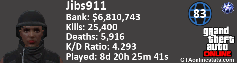 [URL=http://GTAonlinestats.com/showplayer/Jibs911/2][IMG]http://GTAonlinestats.com/signature/Jibs911/2/sig.png[/IMG][/URL]