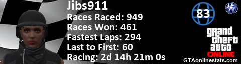 [URL=http://GTAonlinestats.com/showplayer/Jibs911/2][IMG]http://GTAonlinestats.com/racesignature/Jibs911/2/sig.png[/IMG][/URL]