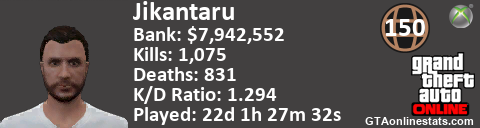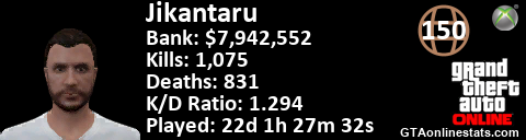 <a href="http://GTAonlinestats.com/showplayer/Jikantaru"><img src="http://GTAonlinestats.com/signature/Jikantaru/sig.png" alt="Jikantaru" border="0" /></a>