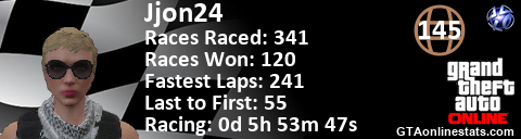 <a href="http://GTAonlinestats.com/showplayer/Jjon24"><img src="http://GTAonlinestats.com/racesignature/Jjon24/sig.png" alt="Jjon24" border="0" /></a>