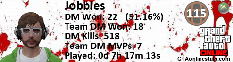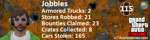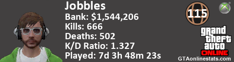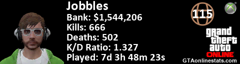 [URL=http://GTAonlinestats.com/showplayer/Jobbles][IMG]http://GTAonlinestats.com/signature/Jobbles/sig.png[/IMG][/URL]