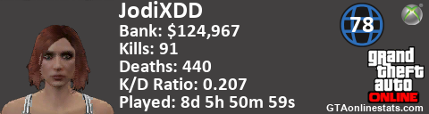 <a href="http://GTAonlinestats.com/showplayer/JodiXDD"><img src="http://GTAonlinestats.com/signature/JodiXDD/sig.png" alt="JodiXDD" border="0" /></a>