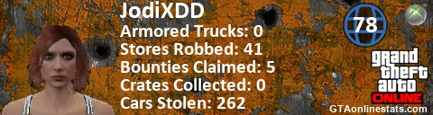 [URL=http://GTAonlinestats.com/showplayer/JodiXDD][IMG]http://GTAonlinestats.com/crimesignature/JodiXDD/sig.png[/IMG][/URL]