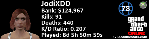 [URL=http://GTAonlinestats.com/showplayer/JodiXDD][IMG]http://GTAonlinestats.com/randomsignature/JodiXDD/sig.png[/IMG][/URL]