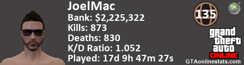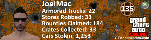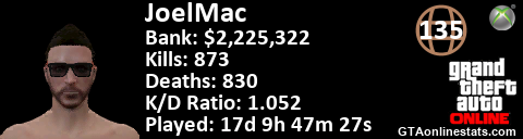 <a href="http://GTAonlinestats.com/showplayer/JoelMac"><img src="http://GTAonlinestats.com/randomsignature/JoelMac/sig.png" alt="JoelMac" border="0" /></a>