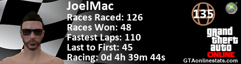 [URL=http://GTAonlinestats.com/showplayer/JoelMac][IMG]http://GTAonlinestats.com/racesignature/JoelMac/sig.png[/IMG][/URL]