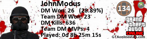 [URL=http://GTAonlinestats.com/showplayer/JohnModus][IMG]http://GTAonlinestats.com/signature/JohnModus/sig.png[/IMG][/URL]