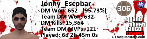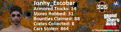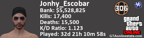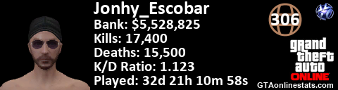 [URL=http://GTAonlinestats.com/showplayer/Jonhy_Escobar][IMG]http://GTAonlinestats.com/dmsignature/Jonhy_Escobar/sig.png[/IMG][/URL]
