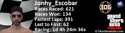 [URL=http://GTAonlinestats.com/showplayer/Jonhy_Escobar][IMG]http://GTAonlinestats.com/racesignature/Jonhy_Escobar/sig.png[/IMG][/URL]